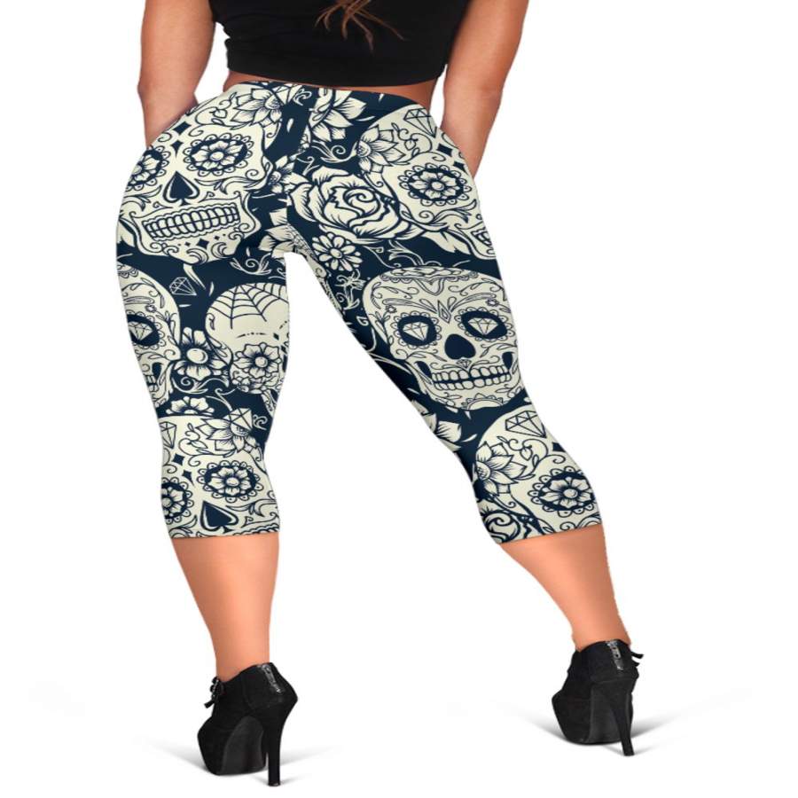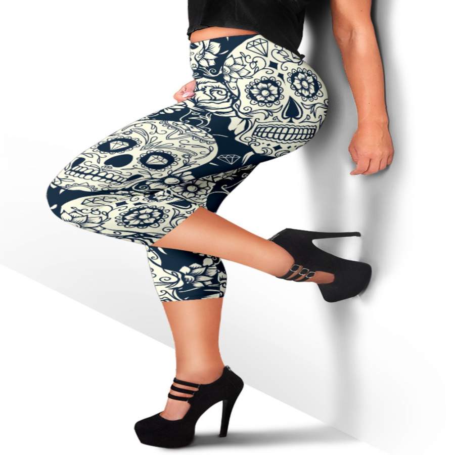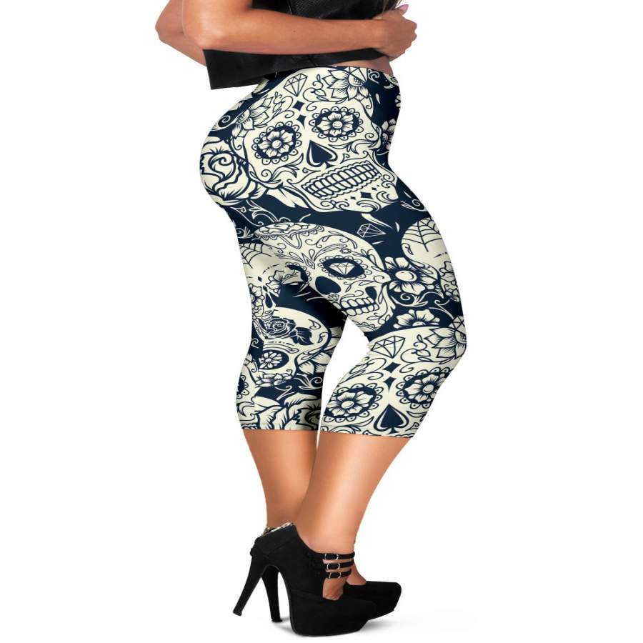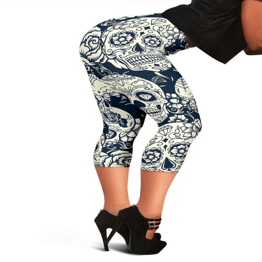 White Floral Sugar Skull Pattern Print Women’s Capri Leggings