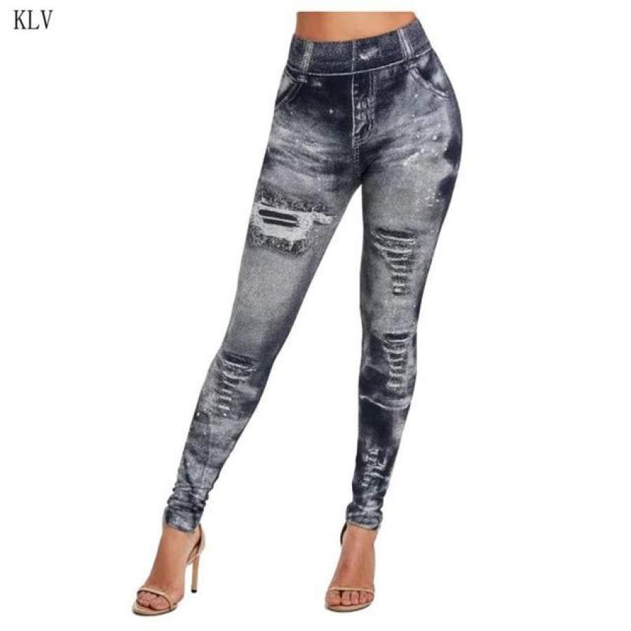 Women Imitation Distressed Denim Jeans Leggings Casual High Waist Slim Elastic Pencil Pants